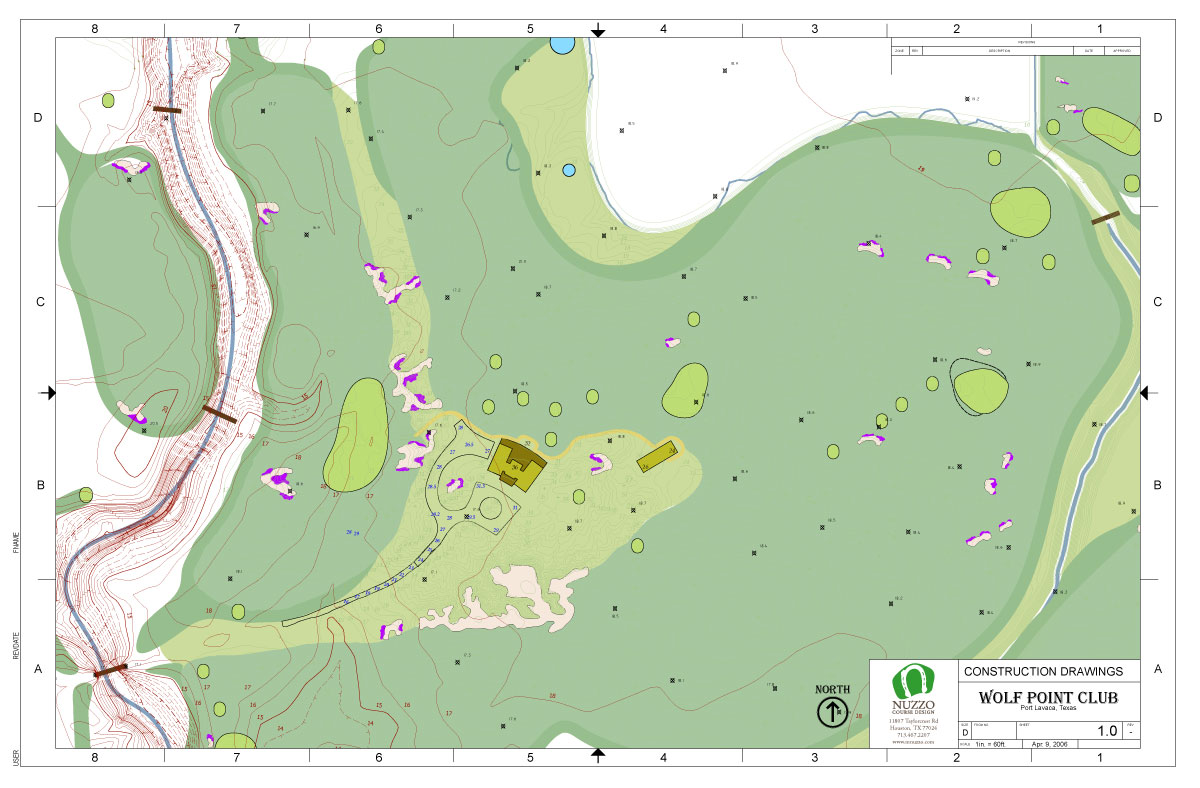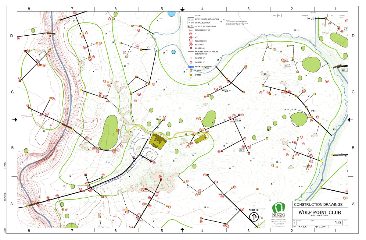 Comprehensive Construction Plans The following plans were all created for the support of the construciton of Wolf Point Club. The 32 page complete set of plans were utilized for irrigation and drainage quantity orders. They were also transferred for use to a hand held GPS unit for accurate installation and take offs. Bidding contractors commented that they had never seen more detailed plans. |