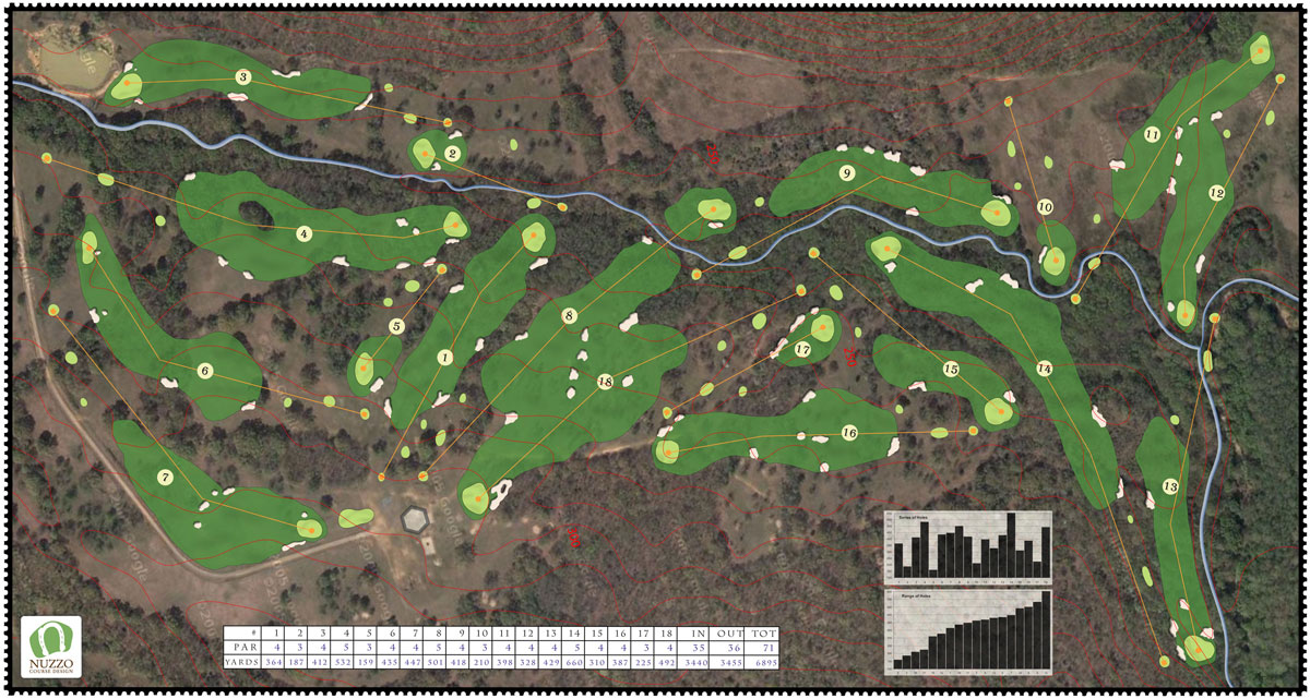 Blanco Golf Club - Texas Baxter Spann was asked to route a development course on 750 acres. To support the project, I created a core golf plan as an alternative. Alas, the maximized lot premium plan was chosen. Note constant variation of hole par throughout the round and the distributed hole lengths by clicking the image to the right. |