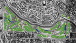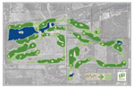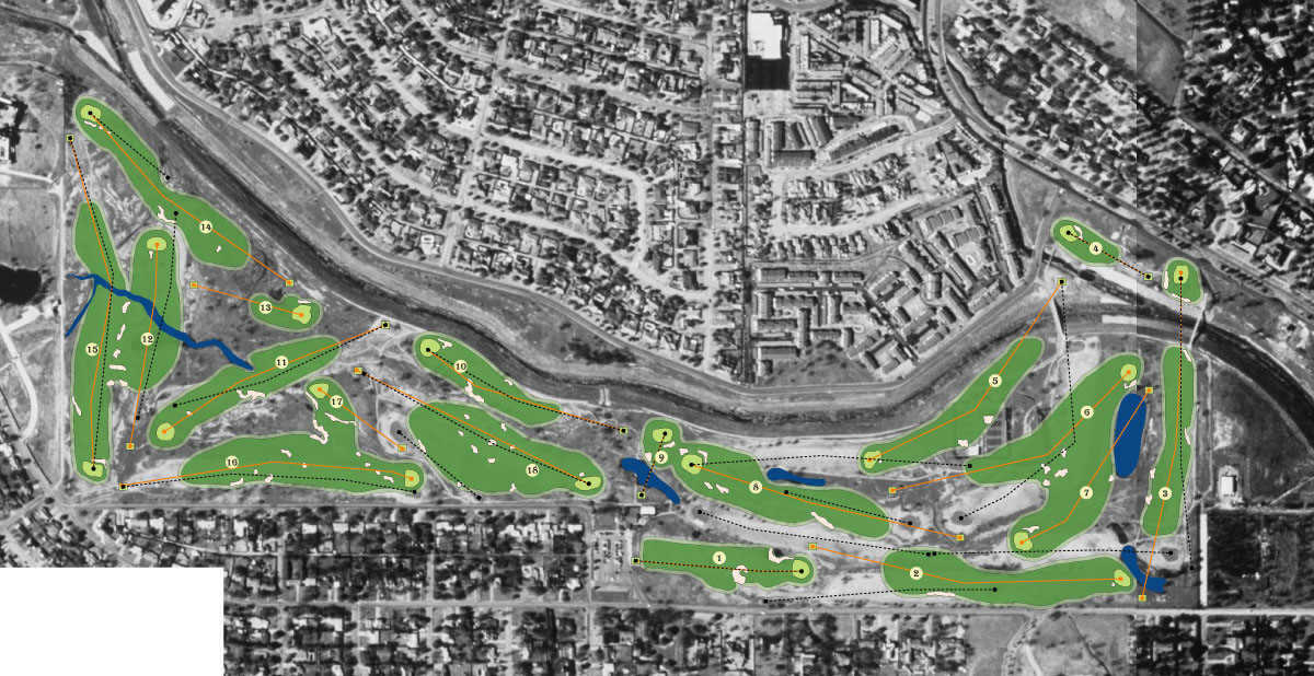 Weeks Park Golf Course - Texas Baxter Spann was asked to present three renovation ideas for an existing course and I was tasked with creating an ideal golf layout. Taking advantage of three unused triangular areas created the routing at right. The black dotted lines are the old hole corridors. |