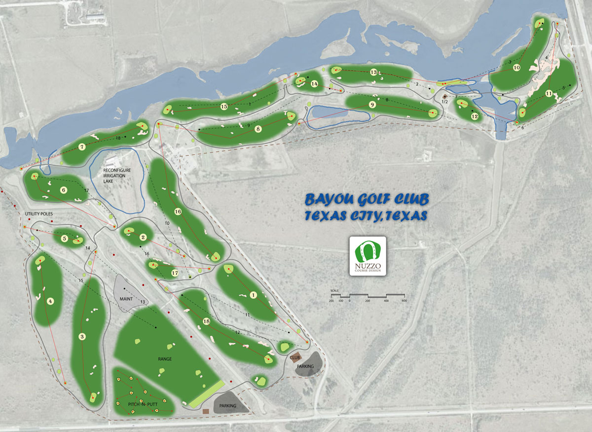 Bayou Golf Course - Texas Currently in planning to redesign a Joe Finger designed 40 year old municipal course. The principal feature, a bayou, passes by the course without much impact. The hole corridors will change and each will be significantly improved. The bayou will be utilized much more strategically. The black dotted lines on the image at right are the existing holes. Click to view an enlarged illustration. |