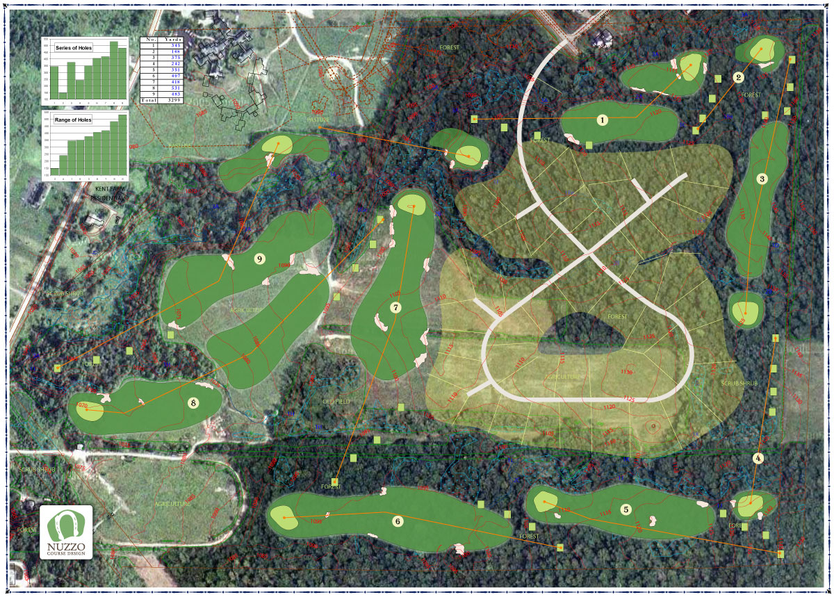 Bull Creek Golf Club - Arkansas In order to minimize construction expenses if the land is approprite, you can keep the clearing budget minimized, and play the golf through natural tree coridors, there by keeping the trees natural looking, and minimizing costs. The routing pictured at right keeps many of the natural coridors in tact. |